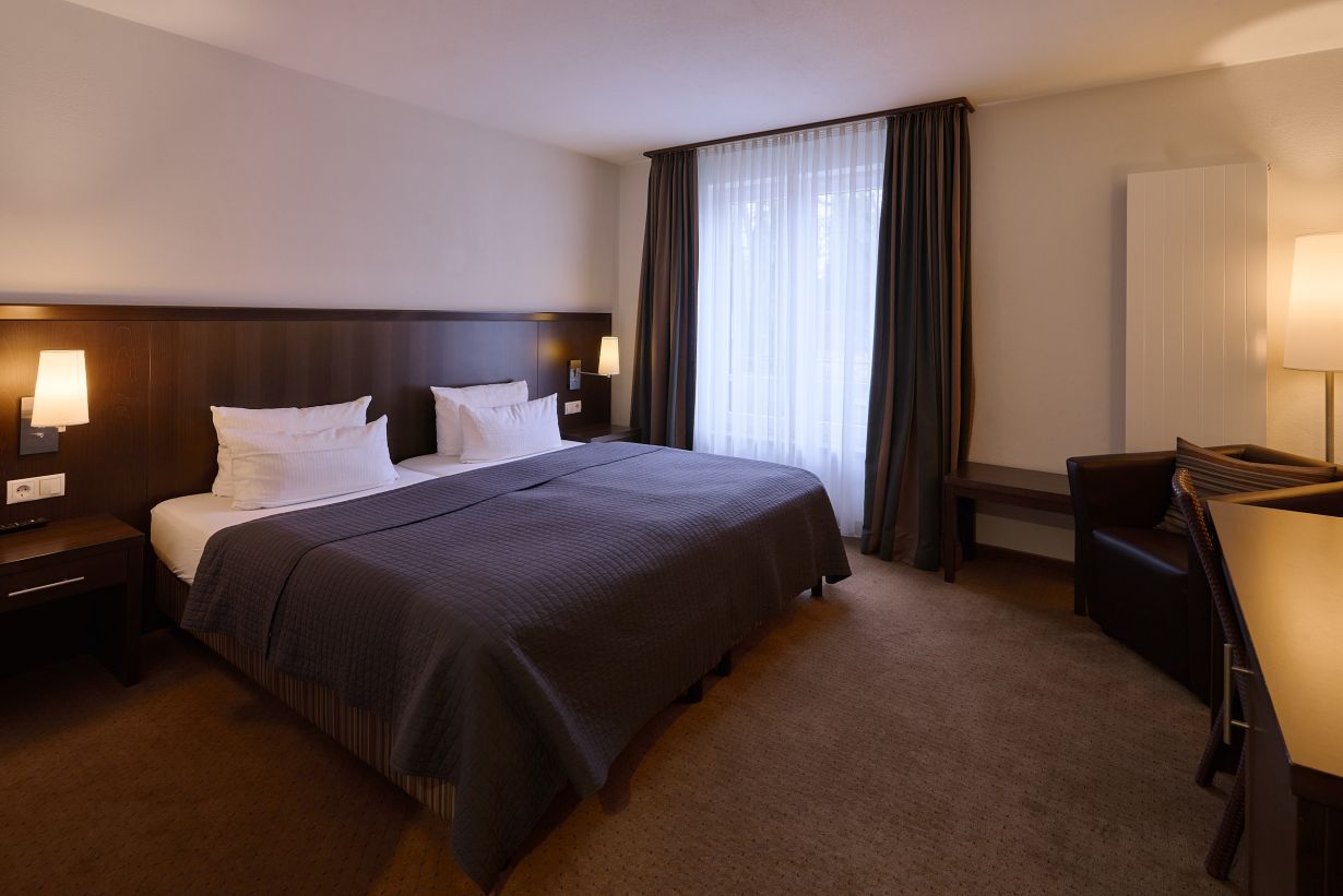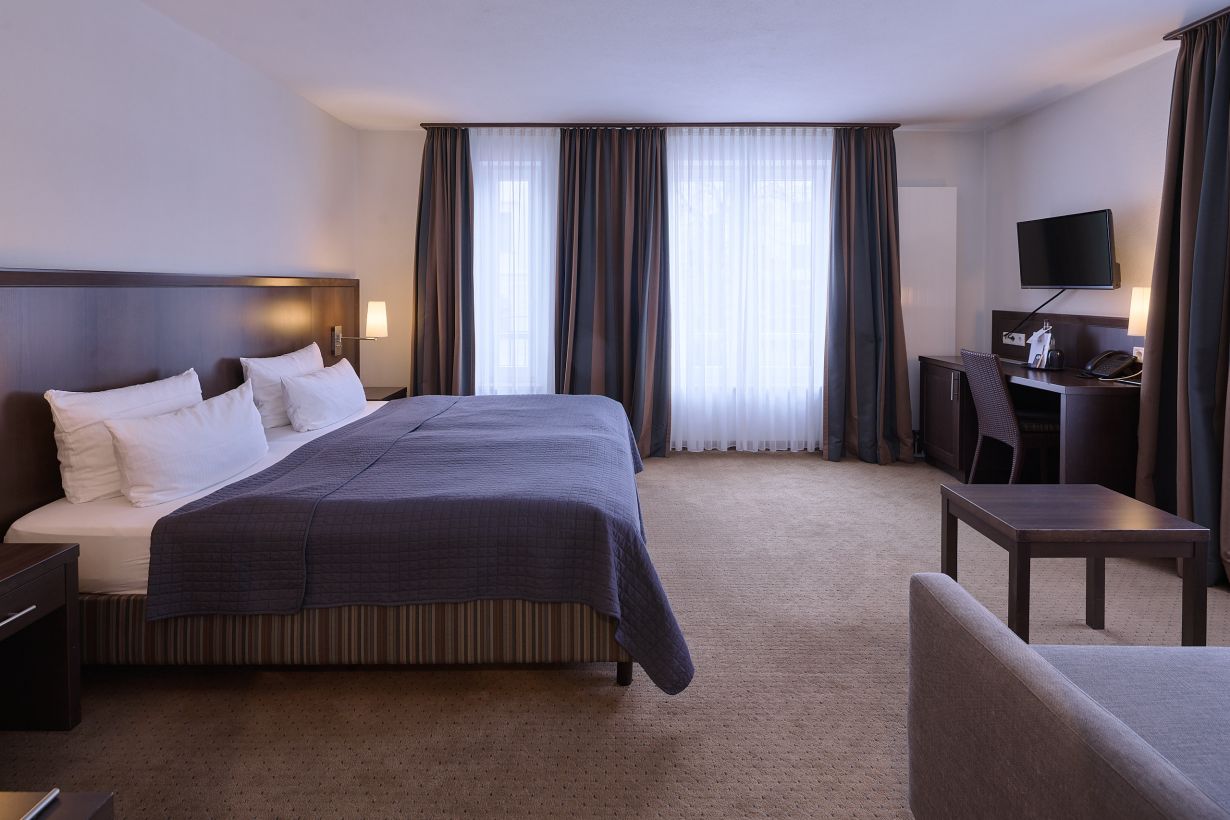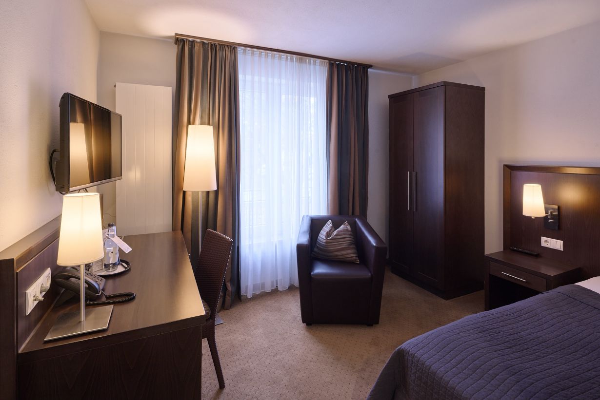 Unsere stilvoll und mit viel Liebe zum Detail eingerichteten Einzel- und Doppelzimmer bieten Ihnen eine hochwertige Ausstattung, die keine Wünsche offenlässt: ein ergonomischer Schreibtisch, Ledersessel oder Sofa, Flatscreen-TV mit internationalen Programmen, Telefon, Minibar und kostenfreies WLAN sorgen für hohen Komfort.
