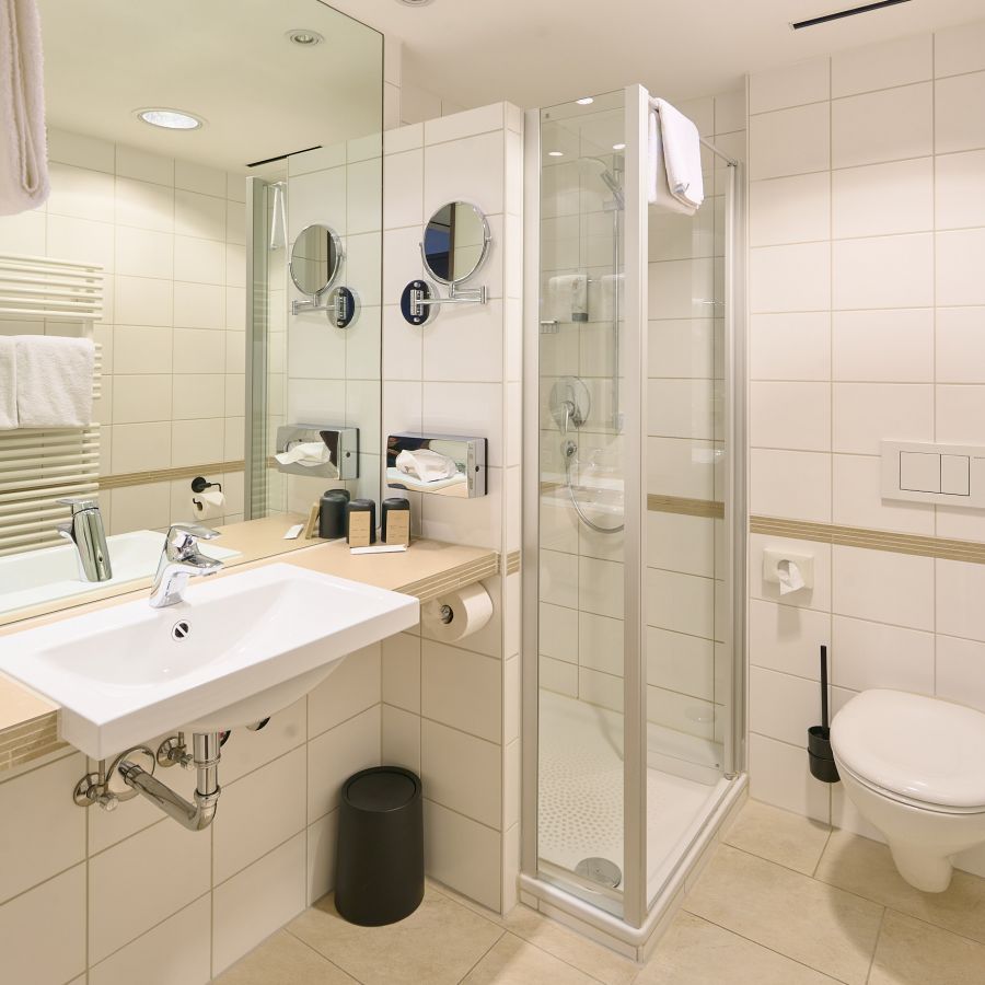Badewanne/Dusche, WC, Haarfön, Kosmetikspiegel