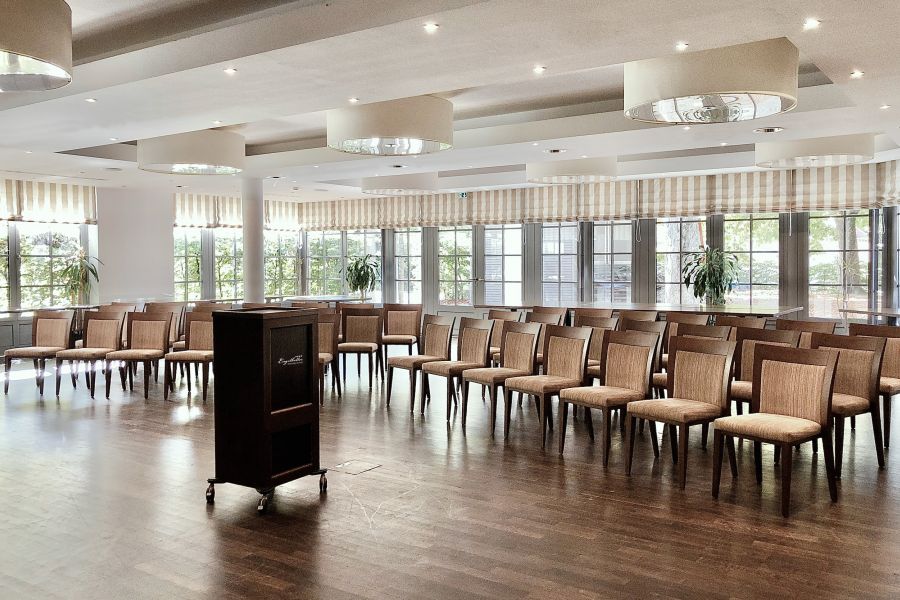 Unser großzügiger Wintergarten bietet mit einer Grundfläche von 162 m² ideale Bedingungen für Tagungen mit bis zu 80 Gästen. Dank der offenen Architektur mit bodentiefen Fenstern genießen Sie eine lichtdurchflutete Atmosphäre, die auf Wunsch verdunkelt werden kann – perfekt für Präsentationen oder stimmungsvolle Events.